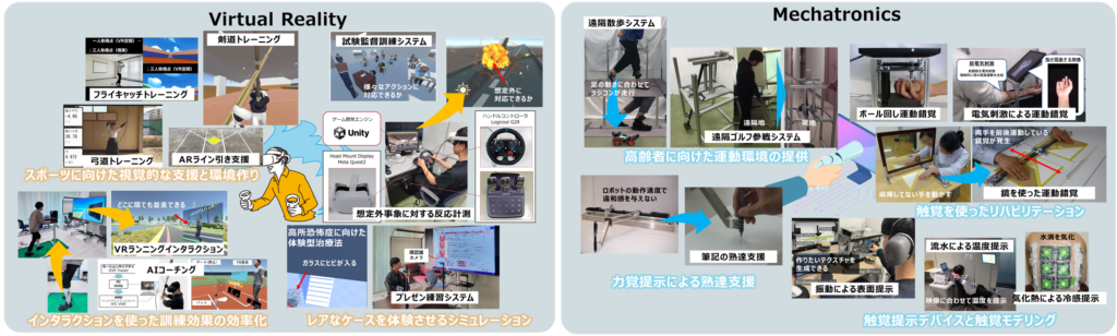 VRM Lab.では,バーチャルリアリティとメトロ二クスを融合したスポーツの訓練システムやリハビリテーション、触力覚提示デバイスやインタラクションシステムの開発をしています。