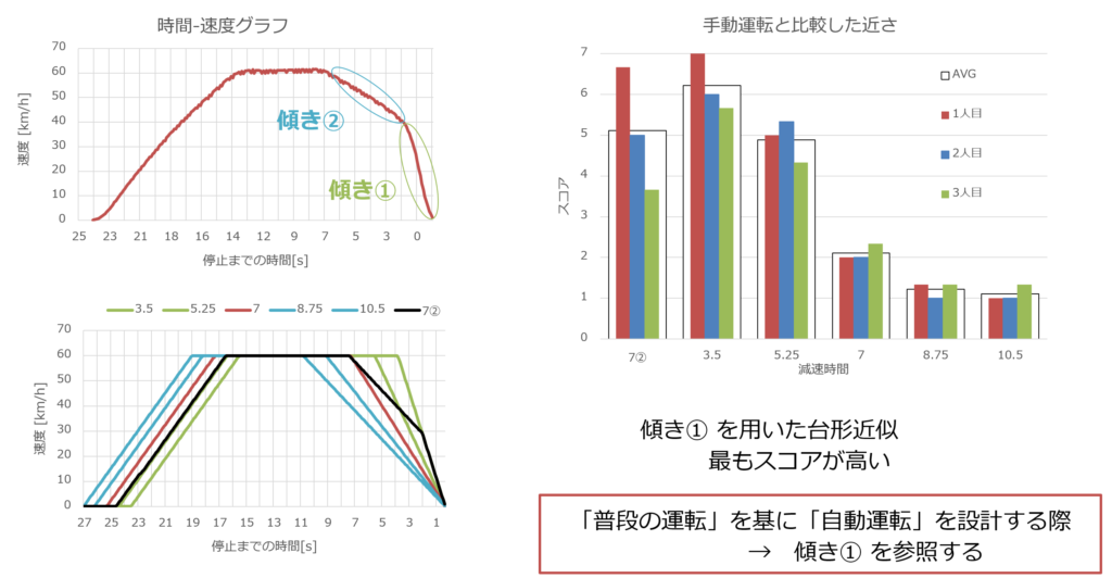自動運転技術の発展途上において、ドライバーの自動運転システムに対する信頼は一つの課題である。主な要因として自動運転システムのブレーキの操作タイミングや操作量が、普段の自身の操作とは異なることがあげられる。そこで、本研究では自動運転システムの設計の基礎研究として、ドライバの実際の操作を基にしたブレーキ操作の自動運転システムを開発した。