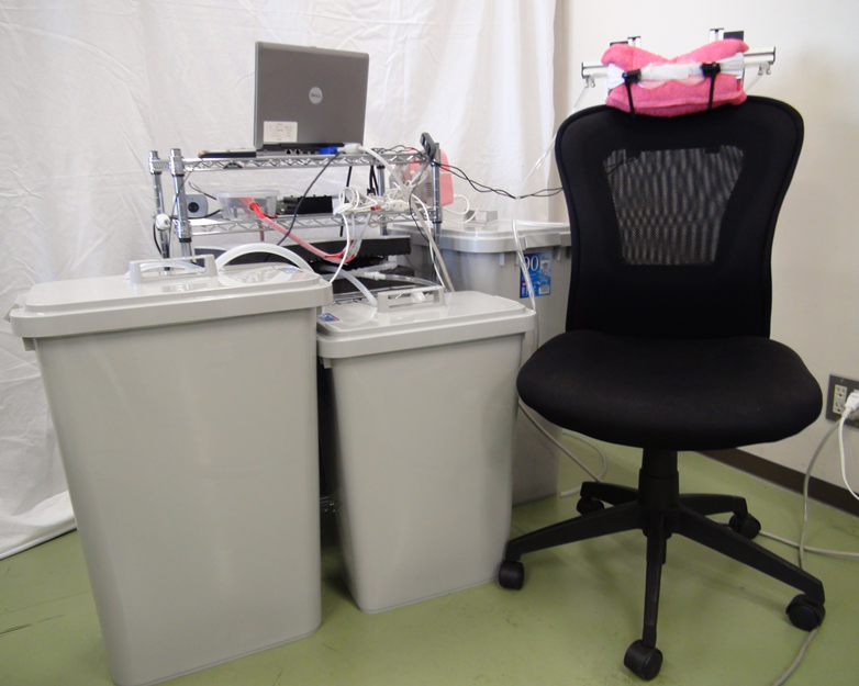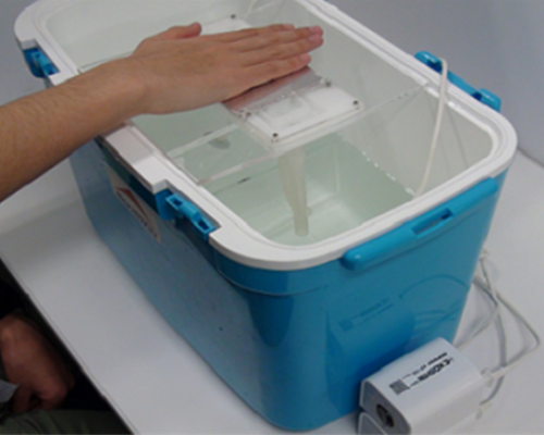 温度感覚に関してサーマルグリル錯覚という錯覚があります.温刺激と冷刺激を交互かつ同時提示するとあたかも火傷を負ったかのような痛みや灼熱感,不快感が生じるというものです.皮膚に損傷を与えることなく,擬似的に痛みを生起させることが可能であるため,この錯覚をヒューマンインタフェースへの様々な応用が考えられます.そこで本研究室では,熱媒体に水を用いて,サーマルグリル錯覚をより多くの人により強く生起可能なデバイスを開発し応用を検討しています.